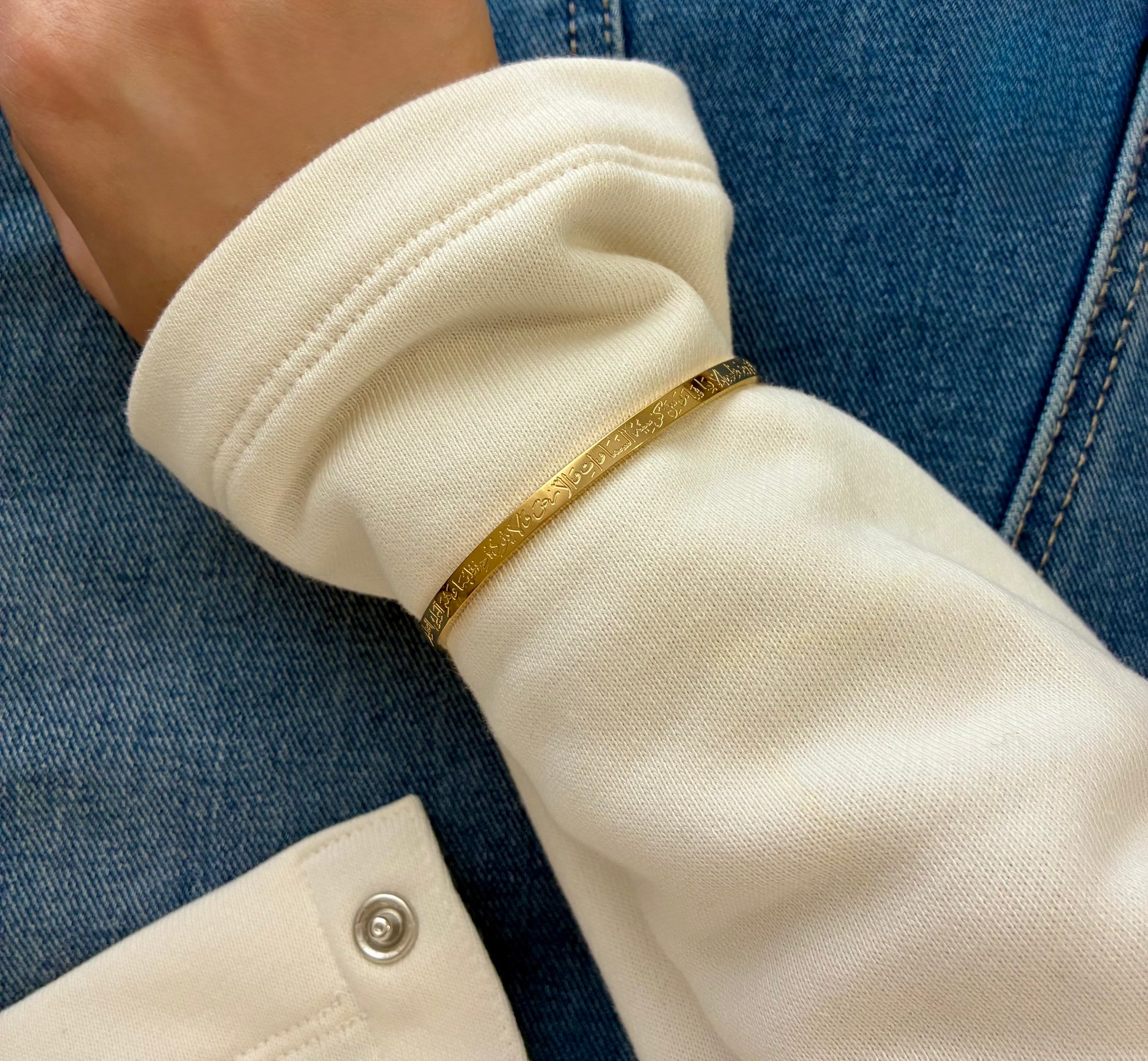 This elegant bracelet features a delicate engraving of Ayatul Kursi, beginning on the front and continuing seamlessly to the back. Designed with minimalist sophistication, it combines timeless style with deep spiritual significance.