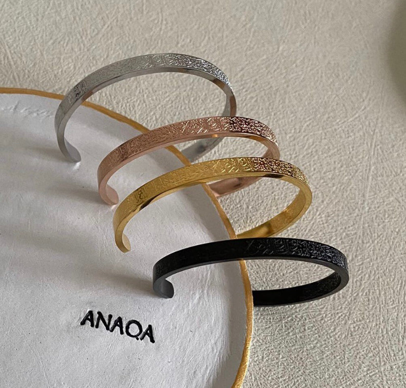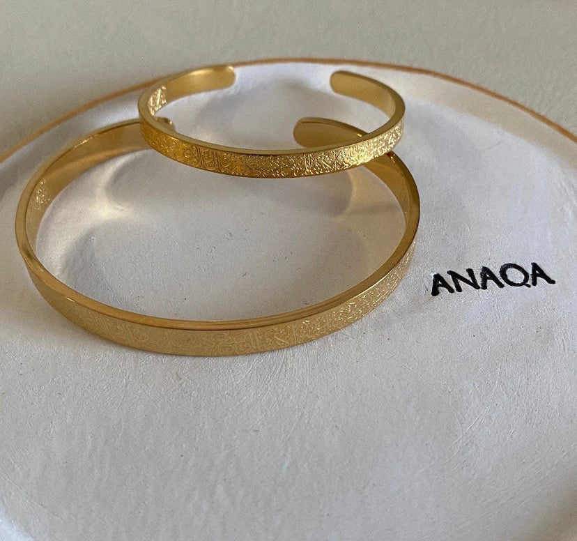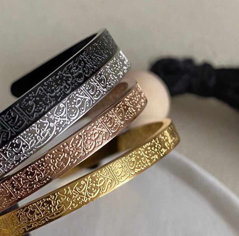 This bracelet is beautifully engraved with the Ayatul Kursi verse, starting the engraving on the front and finishing on the back, making it a minimal elegant jewellery piece with a powerful meaning behind its concept.
