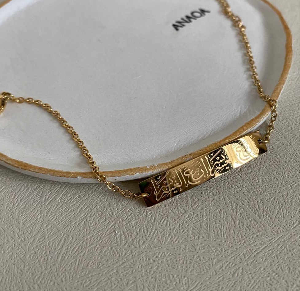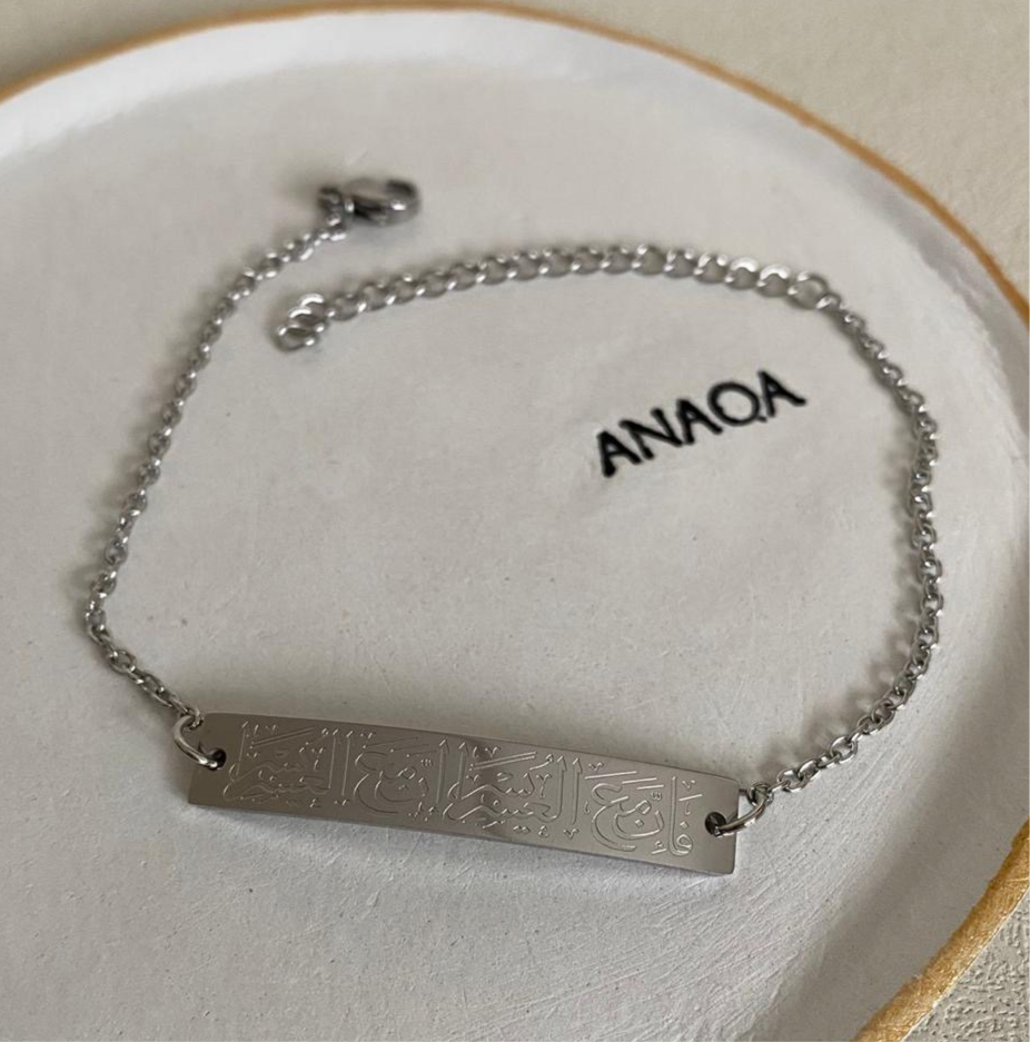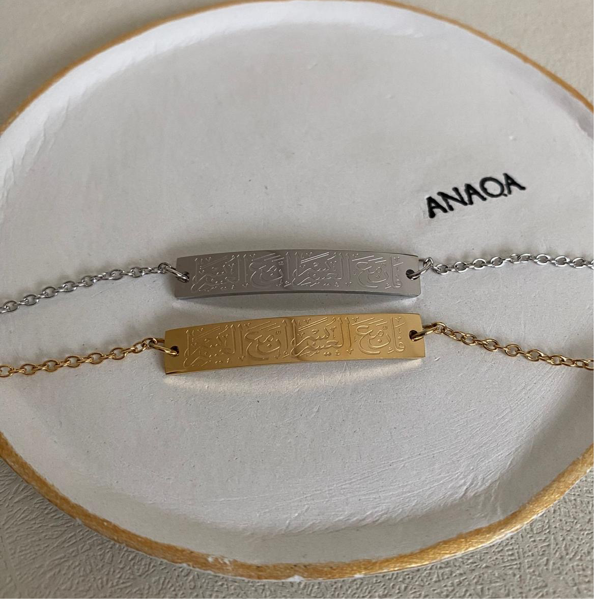 This bracelet is beautifully engraved with a meaningful verse from the Holy Quran Surat Al-Sharh reminding us that [Indeed, with hardship [will be] ease] 94:6