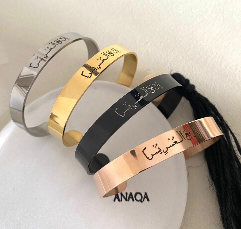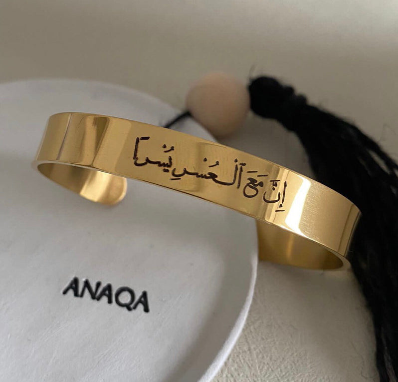 This bracelet is beautifully engraved with a meaningful verse from the Holy Quran Surat Al-Sharh reminding us that [Indeed, with hardship [will be] ease] 94:6