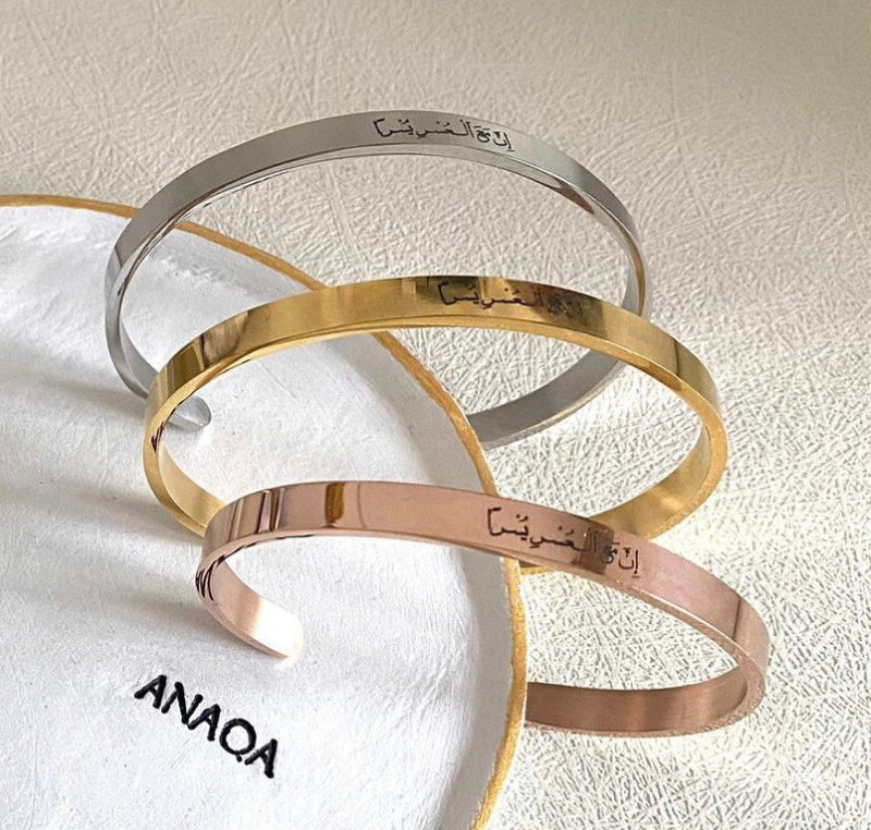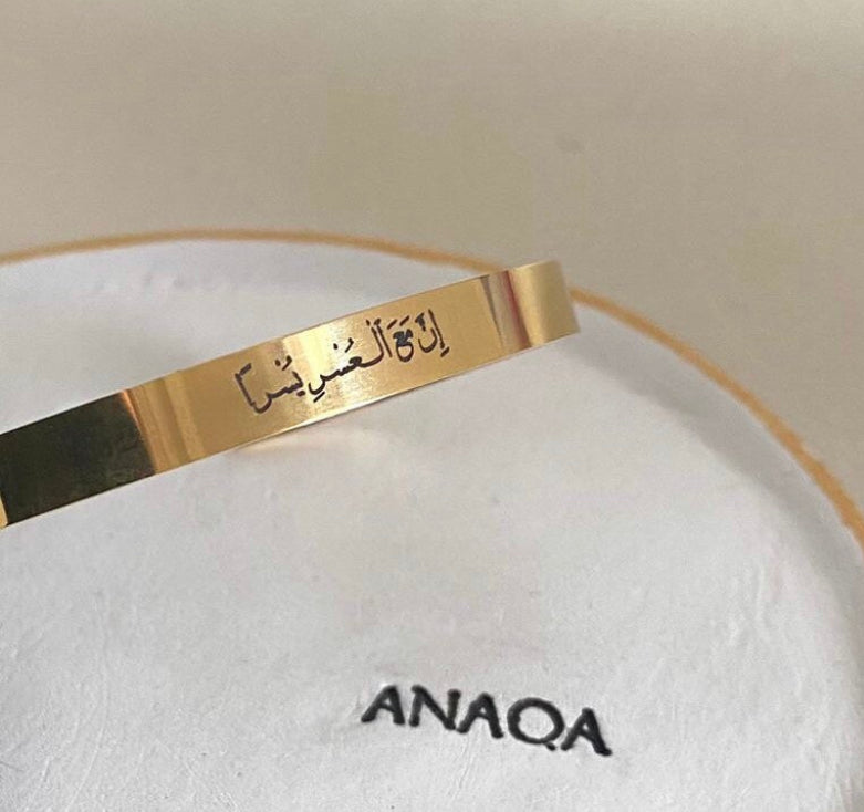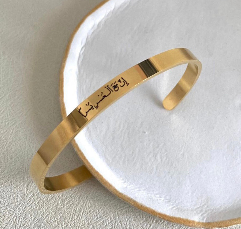 This bracelet is beautifully engraved with a meaningful verse from the Holy Quran Surat Al-Sharh reminding us that [Indeed, with hardship [will be] ease] 94:6