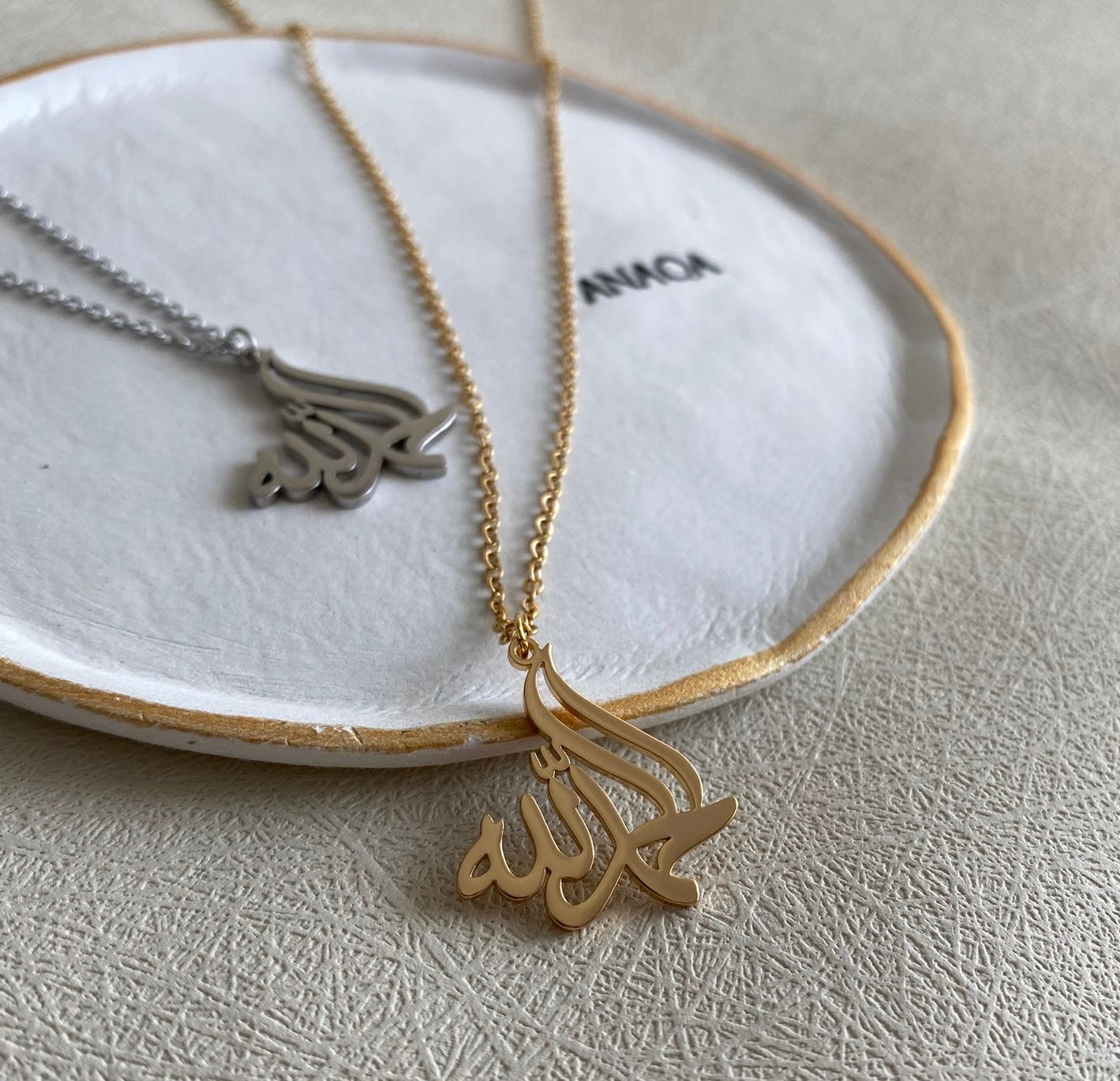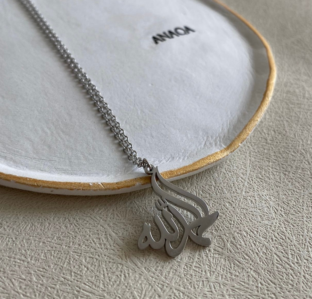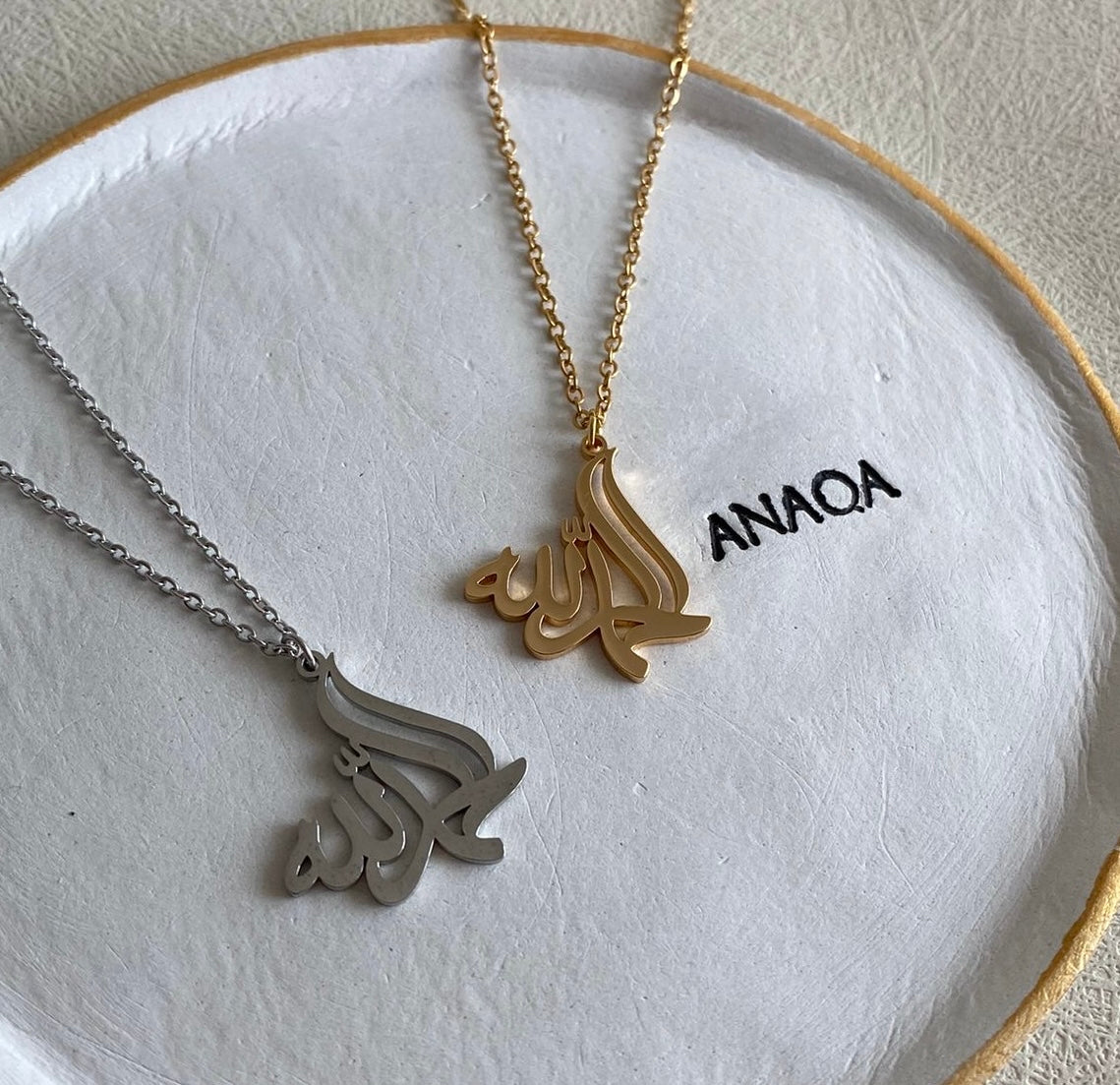 This necklace spells the word الحمد لله , Alhamdulliah [ Praise be to Allah (God) ] in Arabic Calligraphy. This necklace serves as a reminder that we should always be thankful to Allah.